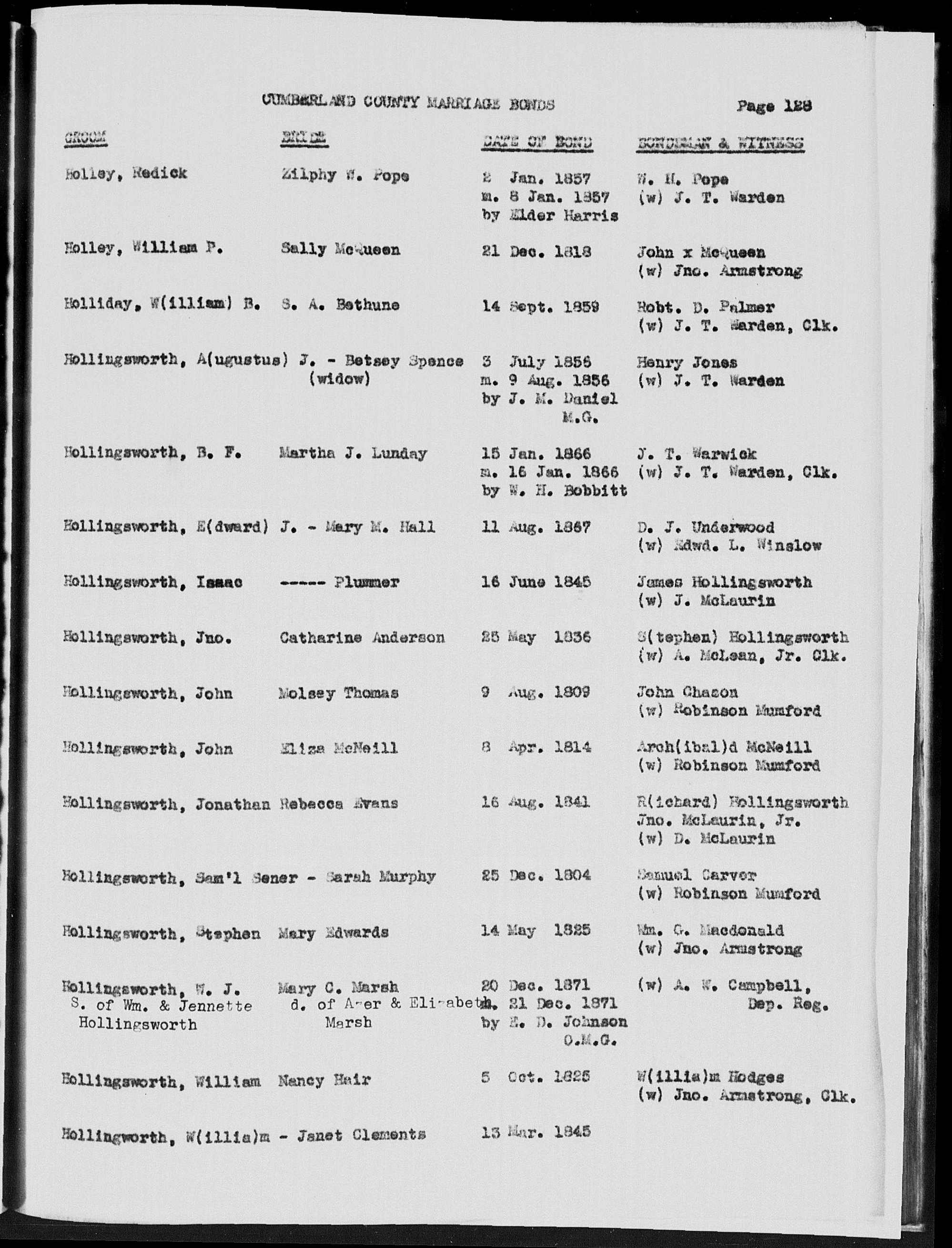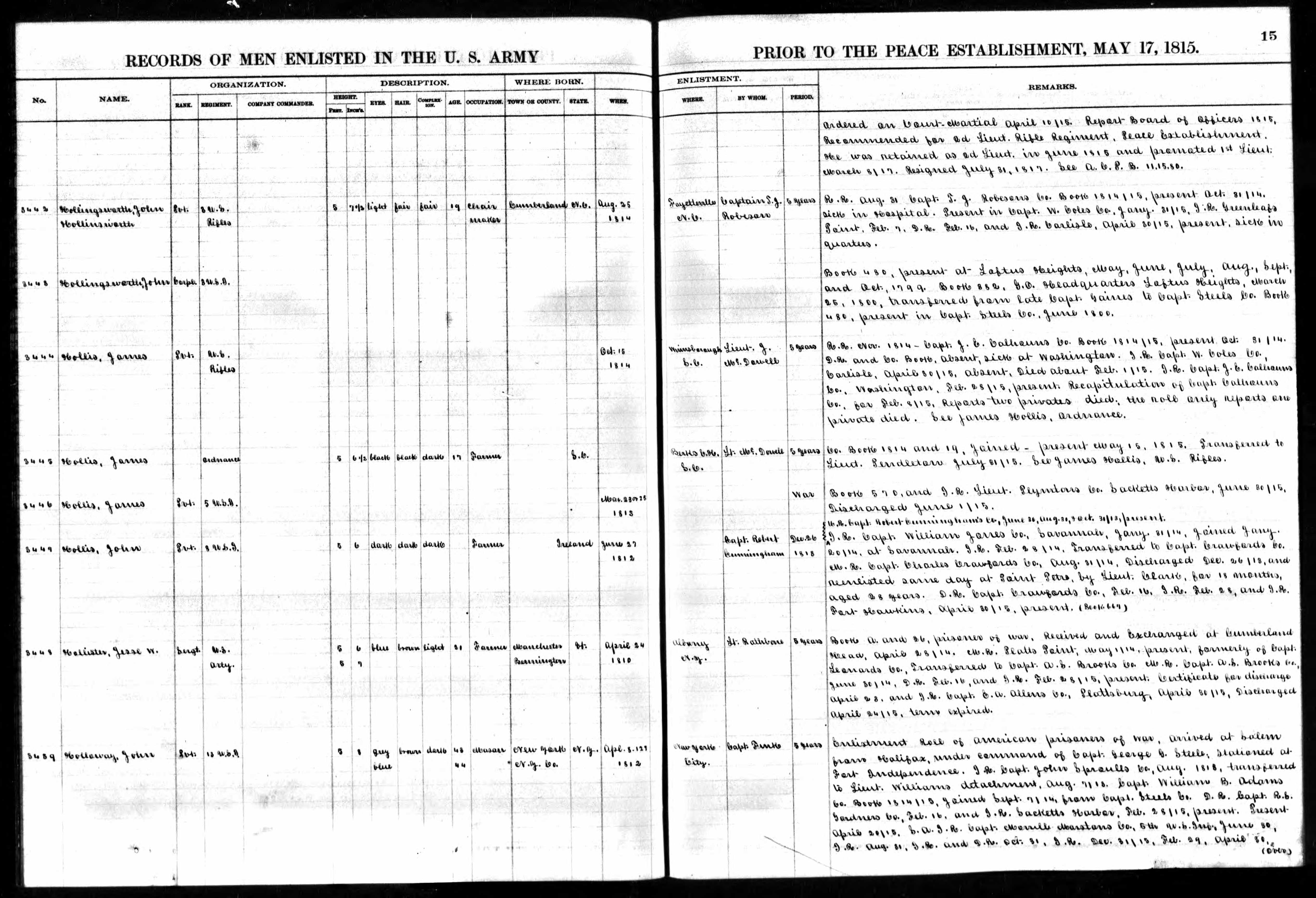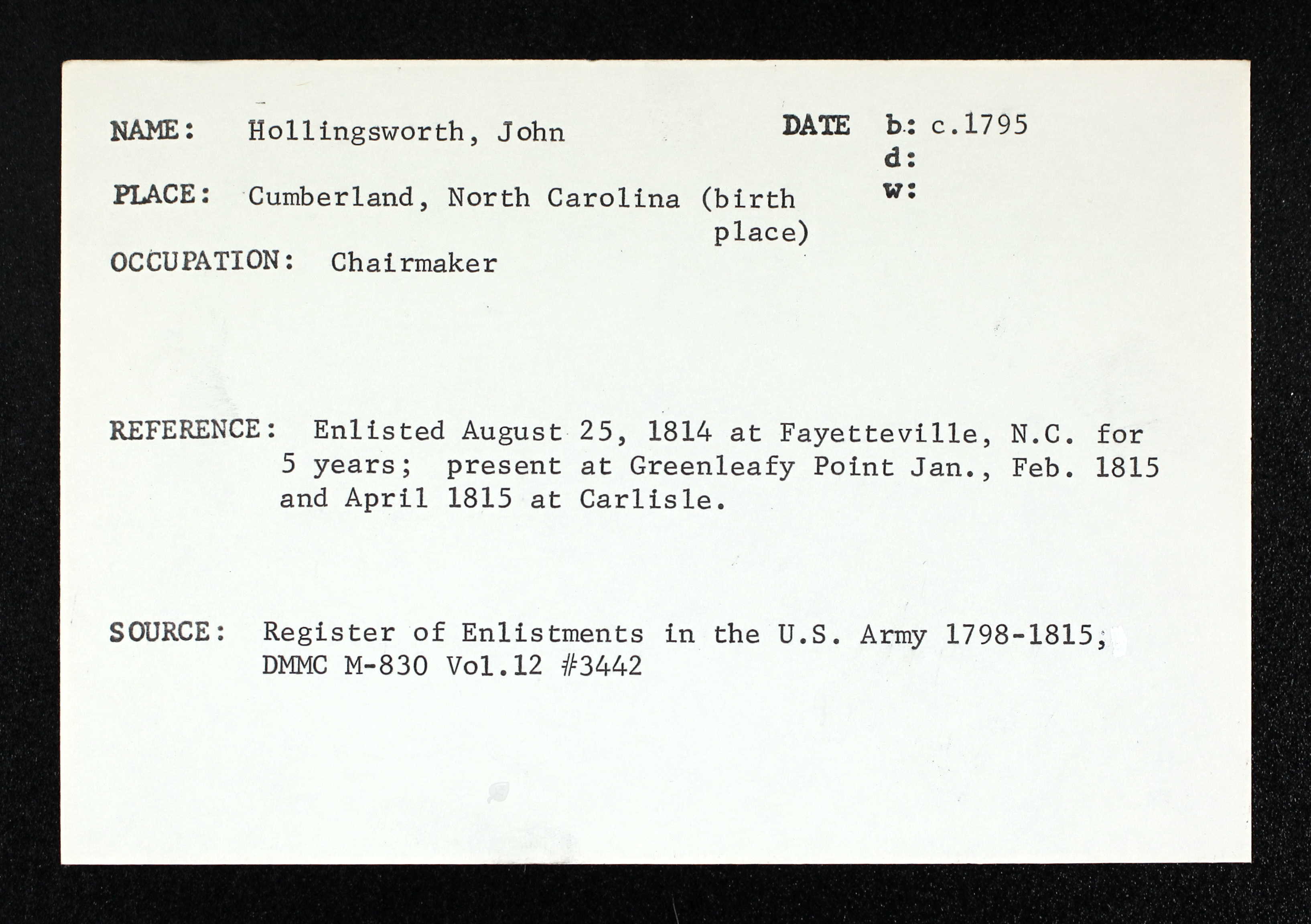 JOHN (JNO) HOLLINGSWORTH 1794 - 1850, Cumberland, NC 1840 Census - Page1 , Page2 1814 Army Registration - Page1 , Page2 FATHER: Believed to be Stephen (1770-1838) MOTHER: Believed to be Annie Smith (d.1838) SIBLINGS: Believed to be Stephen Jr., William ABOUT: In Army during "War of 1812" |