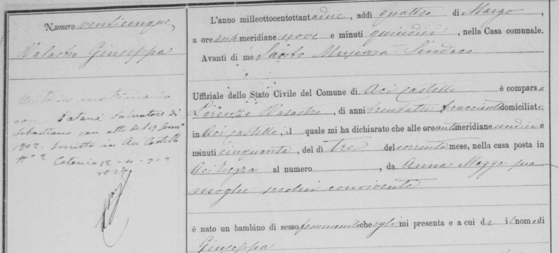 Birth Record for Giuseppa "Josiphine" Valastro b.1882 (1882 - Nati - Aci Castello - Pg11a - Giuseppa of Lorenzo Valastro of Aci Trezza - Anna Mazza)